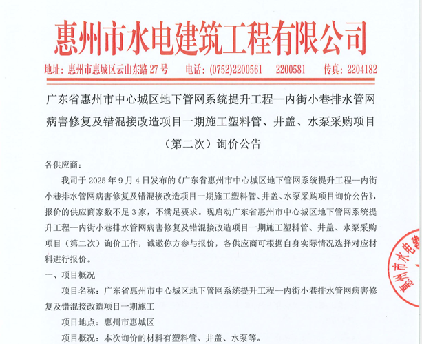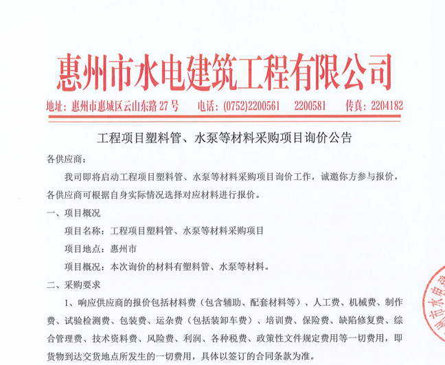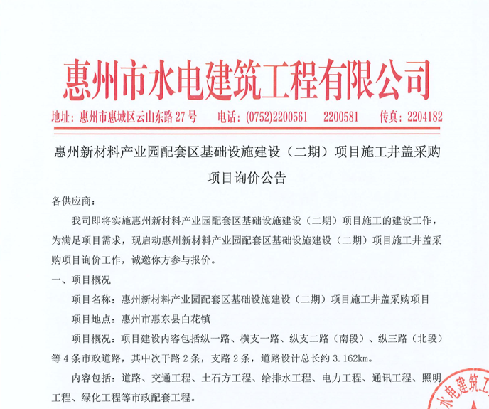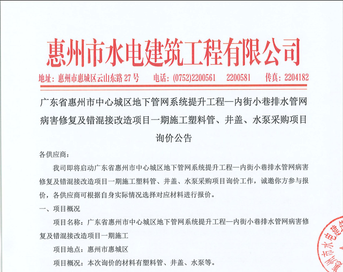 惠州市水電建筑工程有限公司成立于一九六四年四月,隸屬惠州市水務(wù)集團(tuán)有限公司,是一家國(guó)有綜合性施工企業(yè),主營(yíng)水利水電工程、房屋建筑、市政工程等施工業(yè)務(wù)。公司擁有水利水電工程施工總承包一級(jí)、建筑工程施工總承包一級(jí)、市政公用工程施工總承包一級(jí)、公路工程施工總承包三級(jí),公路路基、路面及建筑裝修裝飾專業(yè)承包二級(jí),環(huán)保工程、機(jī)電安裝、河湖整治、輸變電工程專業(yè)承包三級(jí)等經(jīng)營(yíng)資質(zhì)……